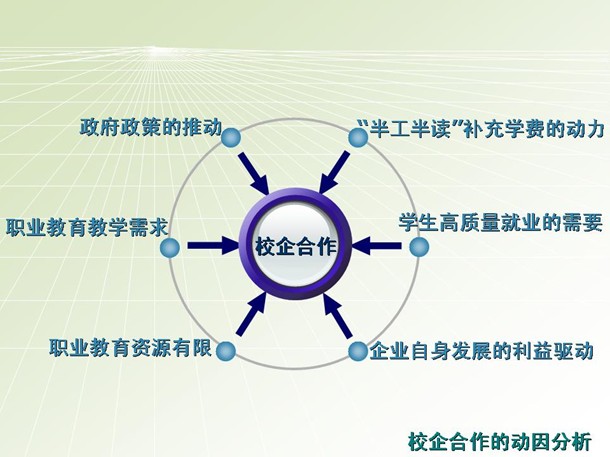 “校企合作”的动因来自于学校和企业双方的需要和共赢。通过研究,我们认为动力来自六个方面:(见下图)