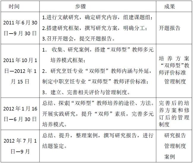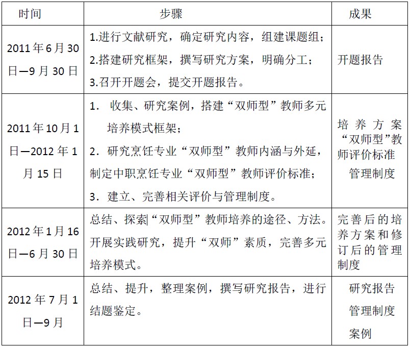 本课题由校长亲自主持,教学副校长、教科研主任、副主任及全体烹饪教师共同参与,研究力量雄厚,保障条件充分,任务分工明确,研究步骤合理。我们完全按照研究计划按部就班地推进,并形成了不同形式的研究成果,如《烹饪专业“双师型”教师多元培养方案》、《烹饪专业“双师型”教师评价标准》、《“双师型”教师管理制度》、研究案例、研究报告、论文等。具体研究步骤及成果形式如下: