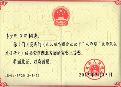 1. 湖北发展研究奖(获奖论文:《武汉城市圈“双师型”教师队伍建设研究》)
