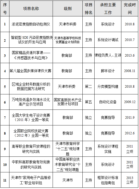 主持教育科学“十二五”规划课题、“天津市高等学校科技发展基金项目”等科研项目7项;2011年取得国家知识产权局专利1项。