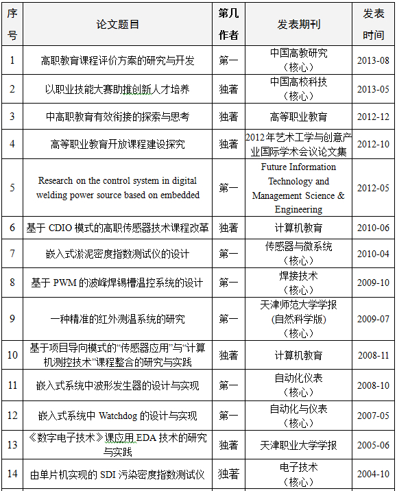本人于1993年9月本科毕业于天津职业技术师范大学,2000年6月调入天津职业大学以来,全身心投入教学工作,认真钻研职业教育理论,熟悉职业教育规律。先后承担了《测控技术》、《传感器技术与应用》、《模/数制作与调试》、《嵌入式EDA系统》、《数字电子技术》、《电子工艺实习》等课程和毕业设计的教学任务,完成科室量均在400学时/年以上。