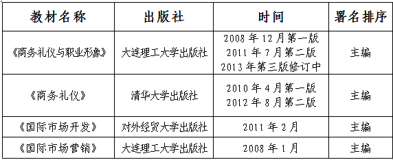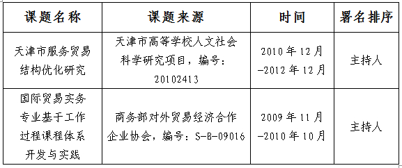 参与编制《天津市商务人才十二五发展规划》;参与编制《天津市服务贸易中长期规划》;组织承办了天津市商务委“天津市千家中小外贸企业培训”项目,完成培训2000余人次,参培企业和区县商务委机关、相关协会等1000多家;主持修订天津市商务系统《服务贸易基础知识问答》手册;主持编写《商务礼仪手册》;担任天津市商务委《商务世界》杂志特约撰稿人,开辟商务礼仪课堂专栏,撰写商务礼仪课堂系列共计13期。